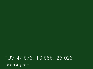 YUV 47.675,-10.686,-26.025 Color is a very dark green color and the nearest color is Parsley #134f19. Hex code #12431a and RGB value is rgb(18,67,26). In RGB color space, this color is composed of 7% red, 26% green, 10% blue, In CMYK color space, this color is composed of 73% cyan, 0% magenta, 61% yellow , 74% black , In HSL color space, this color has a hue angle of 130° , 58% saturation and 17% lightness.