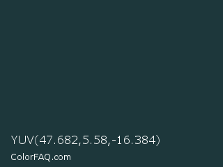 YUV 47.682,5.58,-16.384 Color is a very dark cyan color and the nearest color is Te Papa Green #1e433c. Hex code #1d373b and RGB value is rgb(29,55,59). In RGB color space, this color is composed of 11% red, 22% green, 23% blue, In CMYK color space, this color is composed of 51% cyan, 7% magenta, 0% yellow , 77% black , In HSL color space, this color has a hue angle of 188° , 34% saturation and 17% lightness.