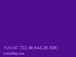 YUV 47.722,48.944,28.308 Color is a normal violet color and the nearest color is Pigment Indigo #4b0082. Hex code #500c93 and RGB value is rgb(80,12,147). In RGB color space, this color is composed of 31% red, 5% green, 58% blue, In CMYK color space, this color is composed of 46% cyan, 92% magenta, 0% yellow , 42% black , In HSL color space, this color has a hue angle of 270° , 85% saturation and 31% lightness.