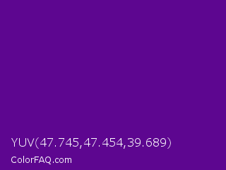 YUV 47.745,47.454,39.689 Color is a dark purple color and the nearest color is Purple #660099. Hex code #5d0690 and RGB value is rgb(93,6,144). In RGB color space, this color is composed of 36% red, 2% green, 56% blue, In CMYK color space, this color is composed of 35% cyan, 96% magenta, 0% yellow , 44% black , In HSL color space, this color has a hue angle of 278° , 92% saturation and 29% lightness.
