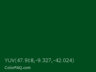 YUV 47.918,-9.327,-42.024 Color is a very dark green color and the nearest color is Kaitoke Green #004620. Hex code #004c1d and RGB value is rgb(0,76,29). In RGB color space, this color is composed of 0% red, 30% green, 11% blue, In CMYK color space, this color is composed of 100% cyan, 0% magenta, 62% yellow , 70% black , In HSL color space, this color has a hue angle of 143° , 100% saturation and 15% lightness.
