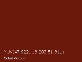 YUV 47.922,-18.203,51.811 Color is a dark red color and the nearest color is Moccaccino #6e1d14. Hex code #6b190b and RGB value is rgb(107,25,11). In RGB color space, this color is composed of 42% red, 10% green, 4% blue, In CMYK color space, this color is composed of 0% cyan, 77% magenta, 90% yellow , 58% black , In HSL color space, this color has a hue angle of 9° , 81% saturation and 23% lightness.