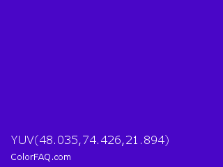 YUV 48.035,74.426,21.894 Color is a normal violet color and the nearest color is Interdimensional Blue #360ccc. Hex code #4906c7 and RGB value is rgb(73,6,199). In RGB color space, this color is composed of 29% red, 2% green, 78% blue, In CMYK color space, this color is composed of 63% cyan, 97% magenta, 0% yellow , 22% black , In HSL color space, this color has a hue angle of 261° , 94% saturation and 40% lightness.