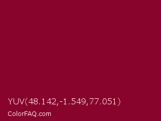 YUV 48.142,-1.549,77.051 Color is a dark rose color and the nearest color is Paprika #8d0226. Hex code #88042d and RGB value is rgb(136,4,45). In RGB color space, this color is composed of 53% red, 2% green, 18% blue, In CMYK color space, this color is composed of 0% cyan, 97% magenta, 67% yellow , 47% black , In HSL color space, this color has a hue angle of 341° , 94% saturation and 27% lightness.