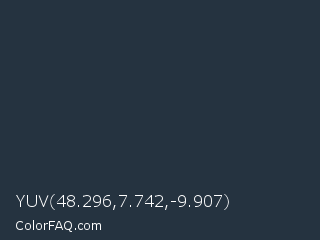 YUV 48.296,7.742,-9.907 Color is a very dark blue color and the nearest color is Gunmetal #2a3439. Hex code #253340 and RGB value is rgb(37,51,64). In RGB color space, this color is composed of 15% red, 20% green, 25% blue, In CMYK color space, this color is composed of 42% cyan, 20% magenta, 0% yellow , 75% black , In HSL color space, this color has a hue angle of 209° , 27% saturation and 20% lightness.