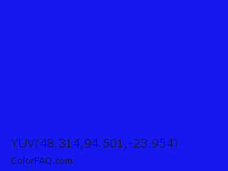 YUV 48.314,94.501,-23.954 Color is a normal blue color and the nearest color is Bluebonnet #1c1cf0. Hex code #1519f0 and RGB value is rgb(21,25,240). In RGB color space, this color is composed of 8% red, 10% green, 94% blue, In CMYK color space, this color is composed of 91% cyan, 90% magenta, 0% yellow , 6% black , In HSL color space, this color has a hue angle of 239° , 88% saturation and 51% lightness.