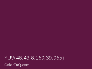 YUV 48.43,8.169,39.965 Color is a dark magenta color and the nearest color is Wine Berry #591d35. Hex code #5e1641 and RGB value is rgb(94,22,65). In RGB color space, this color is composed of 37% red, 9% green, 25% blue, In CMYK color space, this color is composed of 0% cyan, 77% magenta, 31% yellow , 63% black , In HSL color space, this color has a hue angle of 324° , 62% saturation and 23% lightness.