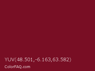 YUV 48.501,-6.163,63.582 Color is a dark red color and the nearest color is Merlot #831923. Hex code #790e24 and RGB value is rgb(121,14,36). In RGB color space, this color is composed of 47% red, 5% green, 14% blue, In CMYK color space, this color is composed of 0% cyan, 88% magenta, 70% yellow , 53% black , In HSL color space, this color has a hue angle of 348° , 79% saturation and 26% lightness.