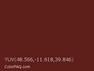YUV 48.566,-11.618,39.846 Color is a dark red color and the nearest color is Cherrywood #651a14. Hex code #5e1e19 and RGB value is rgb(94,30,25). In RGB color space, this color is composed of 37% red, 12% green, 10% blue, In CMYK color space, this color is composed of 0% cyan, 68% magenta, 73% yellow , 63% black , In HSL color space, this color has a hue angle of 4° , 58% saturation and 23% lightness.