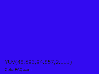 YUV 48.593,94.857,2.111 Color is a normal indigo color and the nearest color is Electric Ultramarine #3f00ff. Hex code #330af1 and RGB value is rgb(51,10,241). In RGB color space, this color is composed of 20% red, 4% green, 95% blue, In CMYK color space, this color is composed of 79% cyan, 96% magenta, 0% yellow , 5% black , In HSL color space, this color has a hue angle of 251° , 92% saturation and 49% lightness.