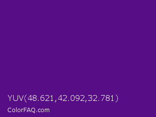 YUV 48.621,42.092,32.781 Color is a dark purple color and the nearest color is Pigment Indigo #4b0082. Hex code #560d86 and RGB value is rgb(86,13,134). In RGB color space, this color is composed of 34% red, 5% green, 53% blue, In CMYK color space, this color is composed of 36% cyan, 90% magenta, 0% yellow , 47% black , In HSL color space, this color has a hue angle of 276° , 82% saturation and 29% lightness.