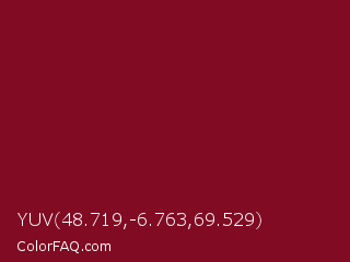 YUV 48.719,-6.763,69.529 Color is a dark red color and the nearest color is Burgundy #800020. Hex code #800b23 and RGB value is rgb(128,11,35). In RGB color space, this color is composed of 50% red, 4% green, 14% blue, In CMYK color space, this color is composed of 0% cyan, 91% magenta, 73% yellow , 50% black , In HSL color space, this color has a hue angle of 348° , 84% saturation and 27% lightness.