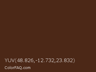 YUV 48.826,-12.732,23.832 Color is a very dark orange color and the nearest color is Brown Derby #492615. Hex code #4c2817 and RGB value is rgb(76,40,23). In RGB color space, this color is composed of 30% red, 16% green, 9% blue, In CMYK color space, this color is composed of 0% cyan, 47% magenta, 70% yellow , 70% black , In HSL color space, this color has a hue angle of 19° , 54% saturation and 19% lightness.