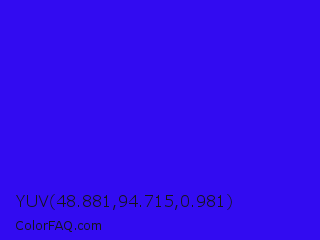 YUV 48.881,94.715,0.981 Color is a normal indigo color and the nearest color is Electric Ultramarine #3f00ff. Hex code #320bf1 and RGB value is rgb(50,11,241). In RGB color space, this color is composed of 20% red, 4% green, 95% blue, In CMYK color space, this color is composed of 79% cyan, 95% magenta, 0% yellow , 5% black , In HSL color space, this color has a hue angle of 250° , 91% saturation and 49% lightness.