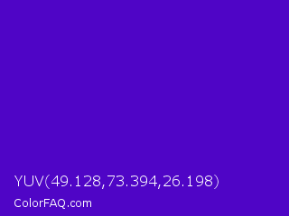 YUV 49.128,73.394,26.198 Color is a normal violet color and the nearest color is Interdimensional Blue #360ccc. Hex code #4f05c6 and RGB value is rgb(79,5,198). In RGB color space, this color is composed of 31% red, 2% green, 78% blue, In CMYK color space, this color is composed of 60% cyan, 97% magenta, 0% yellow , 22% black , In HSL color space, this color has a hue angle of 263° , 95% saturation and 40% lightness.