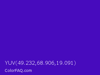 YUV 49.232,68.906,19.091 Color is a normal indigo color and the nearest color is Interdimensional Blue #360ccc. Hex code #470bbd and RGB value is rgb(71,11,189). In RGB color space, this color is composed of 28% red, 4% green, 74% blue, In CMYK color space, this color is composed of 62% cyan, 94% magenta, 0% yellow , 26% black , In HSL color space, this color has a hue angle of 260° , 89% saturation and 39% lightness.