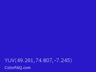 YUV 49.261,74.807,-7.245 Color is a normal indigo color and the nearest color is Interdimensional Blue #360ccc. Hex code #2918c9 and RGB value is rgb(41,24,201). In RGB color space, this color is composed of 16% red, 9% green, 79% blue, In CMYK color space, this color is composed of 80% cyan, 88% magenta, 0% yellow , 21% black , In HSL color space, this color has a hue angle of 246° , 79% saturation and 44% lightness.