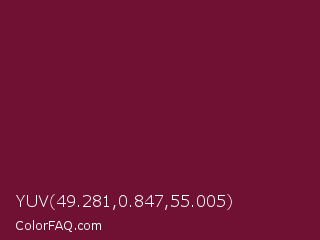 YUV 49.281,0.847,55.005 Color is a dark rose color and the nearest color is Claret #7f1734. Hex code #701133 and RGB value is rgb(112,17,51). In RGB color space, this color is composed of 44% red, 7% green, 20% blue, In CMYK color space, this color is composed of 0% cyan, 85% magenta, 54% yellow , 56% black , In HSL color space, this color has a hue angle of 339° , 74% saturation and 25% lightness.