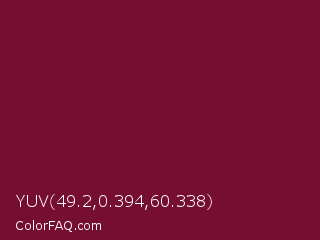 YUV 49.2,0.394,60.338 Color is a dark rose color and the nearest color is Claret #7f1734. Hex code #760e32 and RGB value is rgb(118,14,50). In RGB color space, this color is composed of 46% red, 5% green, 20% blue, In CMYK color space, this color is composed of 0% cyan, 88% magenta, 58% yellow , 54% black , In HSL color space, this color has a hue angle of 339° , 79% saturation and 26% lightness.