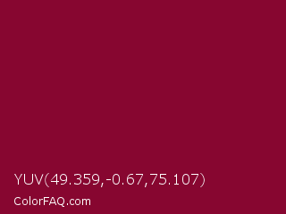 YUV 49.359,-0.67,75.107 Color is a dark rose color and the nearest color is Paprika #8d0226. Hex code #870630 and RGB value is rgb(135,6,48). In RGB color space, this color is composed of 53% red, 2% green, 19% blue, In CMYK color space, this color is composed of 0% cyan, 96% magenta, 64% yellow , 47% black , In HSL color space, this color has a hue angle of 340° , 91% saturation and 28% lightness.
