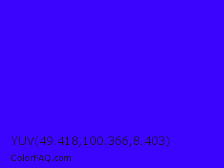 YUV 49.418,100.366,8.403 Color is a normal indigo color and the nearest color is Electric Ultramarine #3f00ff. Hex code #3b05fd and RGB value is rgb(59,5,253). In RGB color space, this color is composed of 23% red, 2% green, 99% blue, In CMYK color space, this color is composed of 77% cyan, 98% magenta, 0% yellow , 1% black , In HSL color space, this color has a hue angle of 253° , 98% saturation and 51% lightness.