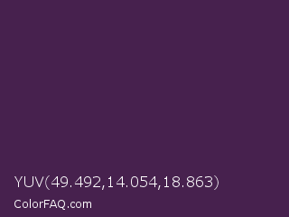 YUV 49.492,14.054,18.863 Color is a very dark purple color and the nearest color is Bossanova #4e2a5a. Hex code #47214e and RGB value is rgb(71,33,78). In RGB color space, this color is composed of 28% red, 13% green, 31% blue, In CMYK color space, this color is composed of 9% cyan, 58% magenta, 0% yellow , 69% black , In HSL color space, this color has a hue angle of 291° , 41% saturation and 22% lightness.