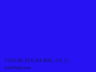 YUV 49.516,94.895,-10.1 Color is a normal indigo color and the nearest color is Bluebonnet #1c1cf0. Hex code #2612f2 and RGB value is rgb(38,18,242). In RGB color space, this color is composed of 15% red, 7% green, 95% blue, In CMYK color space, this color is composed of 84% cyan, 93% magenta, 0% yellow , 5% black , In HSL color space, this color has a hue angle of 245° , 90% saturation and 51% lightness.