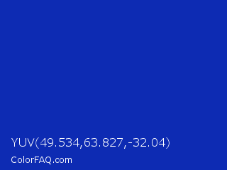 YUV 49.534,63.827,-32.04 Color is a normal blue color and the nearest color is Egyptian Blue #1034a6. Hex code #0d2bb3 and RGB value is rgb(13,43,179). In RGB color space, this color is composed of 5% red, 17% green, 70% blue, In CMYK color space, this color is composed of 93% cyan, 76% magenta, 0% yellow , 30% black , In HSL color space, this color has a hue angle of 229° , 86% saturation and 38% lightness.