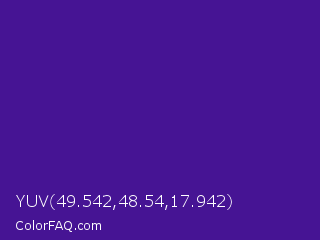 YUV 49.542,48.54,17.942 Color is a normal violet color and the nearest color is Daisy Bush #4f2398. Hex code #461494 and RGB value is rgb(70,20,148). In RGB color space, this color is composed of 27% red, 8% green, 58% blue, In CMYK color space, this color is composed of 53% cyan, 86% magenta, 0% yellow , 42% black , In HSL color space, this color has a hue angle of 263° , 76% saturation and 33% lightness.