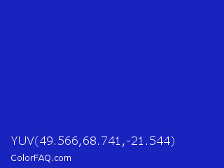 YUV 49.566,68.741,-21.544 Color is a normal blue color and the nearest color is Persian Blue #1c39bb. Hex code #1923bd and RGB value is rgb(25,35,189). In RGB color space, this color is composed of 10% red, 14% green, 74% blue, In CMYK color space, this color is composed of 87% cyan, 81% magenta, 0% yellow , 26% black , In HSL color space, this color has a hue angle of 236° , 77% saturation and 42% lightness.