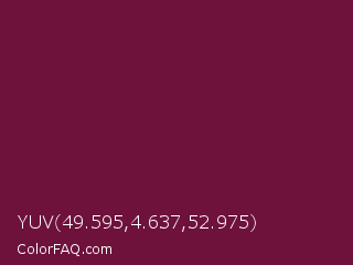 YUV 49.595,4.637,52.975 Color is a dark rose color and the nearest color is Tyrian Purple #66023c. Hex code #6e113b and RGB value is rgb(110,17,59). In RGB color space, this color is composed of 43% red, 7% green, 23% blue, In CMYK color space, this color is composed of 0% cyan, 85% magenta, 46% yellow , 57% black , In HSL color space, this color has a hue angle of 333° , 73% saturation and 25% lightness.