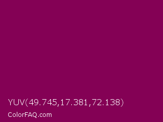 YUV 49.745,17.381,72.138 Color is a dark magenta color and the nearest color is Cardinal Pink #8c055e. Hex code #840155 and RGB value is rgb(132,1,85). In RGB color space, this color is composed of 52% red, 0% green, 33% blue, In CMYK color space, this color is composed of 0% cyan, 99% magenta, 36% yellow , 48% black , In HSL color space, this color has a hue angle of 322° , 98% saturation and 26% lightness.