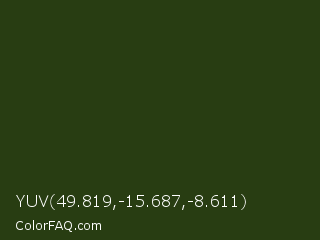 YUV 49.819,-15.687,-8.611 Color is a very dark green color and the nearest color is Turtle Green #2a380b. Hex code #283d12 and RGB value is rgb(40,61,18). In RGB color space, this color is composed of 16% red, 24% green, 7% blue, In CMYK color space, this color is composed of 34% cyan, 0% magenta, 70% yellow , 76% black , In HSL color space, this color has a hue angle of 89° , 54% saturation and 15% lightness.