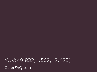 YUV 49.832,1.562,12.425 Color is a very dark rose color and the nearest color is Old Burgundy #43302e. Hex code #402a35 and RGB value is rgb(64,42,53). In RGB color space, this color is composed of 25% red, 16% green, 21% blue, In CMYK color space, this color is composed of 0% cyan, 34% magenta, 17% yellow , 75% black , In HSL color space, this color has a hue angle of 330° , 21% saturation and 21% lightness.