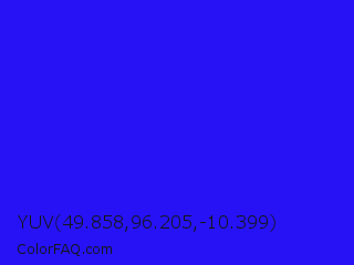 YUV 49.858,96.205,-10.399 Color is a normal indigo color and the nearest color is Bluebonnet #1c1cf0. Hex code #2612f5 and RGB value is rgb(38,18,245). In RGB color space, this color is composed of 15% red, 7% green, 96% blue, In CMYK color space, this color is composed of 84% cyan, 93% magenta, 0% yellow , 4% black , In HSL color space, this color has a hue angle of 245° , 92% saturation and 52% lightness.