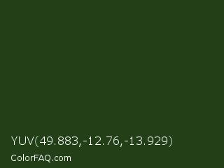 YUV 49.883,-12.76,-13.929 Color is a very dark green color and the nearest color is Mallard #233418. Hex code #223f18 and RGB value is rgb(34,63,24). In RGB color space, this color is composed of 13% red, 25% green, 9% blue, In CMYK color space, this color is composed of 46% cyan, 0% magenta, 62% yellow , 75% black , In HSL color space, this color has a hue angle of 105° , 45% saturation and 17% lightness.
