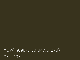 YUV 49.987,-10.347,5.273 Color is a very dark yellow color and the nearest color is Pullman Green #3b331c. Hex code #38331d and RGB value is rgb(56,51,29). In RGB color space, this color is composed of 22% red, 20% green, 11% blue, In CMYK color space, this color is composed of 0% cyan, 9% magenta, 48% yellow , 78% black , In HSL color space, this color has a hue angle of 49° , 32% saturation and 17% lightness.
