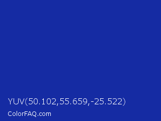 YUV 50.102,55.659,-25.522 Color is a normal blue color and the nearest color is Torea Bay #0f2d9e. Hex code #152ba3 and RGB value is rgb(21,43,163). In RGB color space, this color is composed of 8% red, 17% green, 64% blue, In CMYK color space, this color is composed of 87% cyan, 74% magenta, 0% yellow , 36% black , In HSL color space, this color has a hue angle of 231° , 77% saturation and 36% lightness.