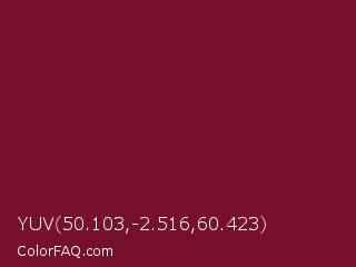 YUV 50.103,-2.516,60.423 Color is a dark rose color and the nearest color is Claret #7f1734. Hex code #77102d and RGB value is rgb(119,16,45). In RGB color space, this color is composed of 47% red, 6% green, 18% blue, In CMYK color space, this color is composed of 0% cyan, 87% magenta, 62% yellow , 53% black , In HSL color space, this color has a hue angle of 343° , 76% saturation and 26% lightness.