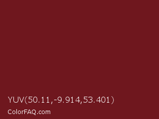 YUV 50.11,-9.914,53.401 Color is a dark red color and the nearest color is Persian Plum #701c1c. Hex code #6f171e and RGB value is rgb(111,23,30). In RGB color space, this color is composed of 44% red, 9% green, 12% blue, In CMYK color space, this color is composed of 0% cyan, 79% magenta, 73% yellow , 56% black , In HSL color space, this color has a hue angle of 355° , 66% saturation and 26% lightness.