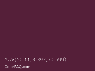 YUV 50.11,3.397,30.599 Color is a dark rose color and the nearest color is Wine Berry #591d35. Hex code #551f39 and RGB value is rgb(85,31,57). In RGB color space, this color is composed of 33% red, 12% green, 22% blue, In CMYK color space, this color is composed of 0% cyan, 64% magenta, 33% yellow , 67% black , In HSL color space, this color has a hue angle of 331° , 47% saturation and 23% lightness.
