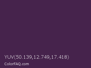 YUV 50.139,12.749,17.418 Color is a very dark purple color and the nearest color is Deep Grape #381a51. Hex code #46234c and RGB value is rgb(70,35,76). In RGB color space, this color is composed of 27% red, 14% green, 30% blue, In CMYK color space, this color is composed of 8% cyan, 54% magenta, 0% yellow , 70% black , In HSL color space, this color has a hue angle of 291° , 37% saturation and 22% lightness.