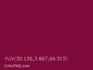 YUV 50.156,3.867,66.515 Color is a dark rose color and the nearest color is Siren #7a013a. Hex code #7e0a3a and RGB value is rgb(126,10,58). In RGB color space, this color is composed of 49% red, 4% green, 23% blue, In CMYK color space, this color is composed of 0% cyan, 92% magenta, 54% yellow , 51% black , In HSL color space, this color has a hue angle of 335° , 85% saturation and 27% lightness.