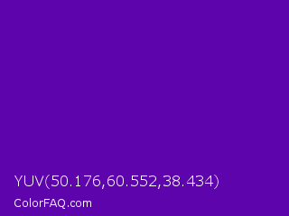 YUV 50.176,60.552,38.434 Color is a normal purple color and the nearest color is Purple #660099. Hex code #5e04ad and RGB value is rgb(94,4,173). In RGB color space, this color is composed of 37% red, 2% green, 68% blue, In CMYK color space, this color is composed of 46% cyan, 98% magenta, 0% yellow , 32% black , In HSL color space, this color has a hue angle of 272° , 95% saturation and 35% lightness.
