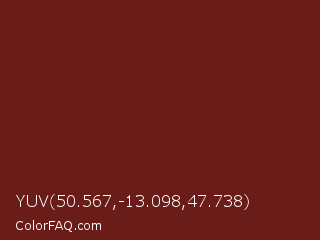 YUV 50.567,-13.098,47.738 Color is a dark red color and the nearest color is Cherrywood #651a14. Hex code #691c18 and RGB value is rgb(105,28,24). In RGB color space, this color is composed of 41% red, 11% green, 9% blue, In CMYK color space, this color is composed of 0% cyan, 73% magenta, 77% yellow , 59% black , In HSL color space, this color has a hue angle of 3° , 63% saturation and 25% lightness.