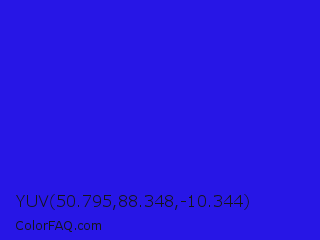 YUV 50.795,88.348,-10.344 Color is a normal indigo color and the nearest color is Bluebonnet #1c1cf0. Hex code #2716e6 and RGB value is rgb(39,22,230). In RGB color space, this color is composed of 15% red, 9% green, 90% blue, In CMYK color space, this color is composed of 83% cyan, 90% magenta, 0% yellow , 10% black , In HSL color space, this color has a hue angle of 245° , 83% saturation and 49% lightness.