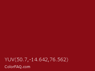 YUV 50.7,-14.642,76.562 Color is a dark red color and the nearest color is Red Devil #860111. Hex code #8a0c15 and RGB value is rgb(138,12,21). In RGB color space, this color is composed of 54% red, 5% green, 8% blue, In CMYK color space, this color is composed of 0% cyan, 91% magenta, 85% yellow , 46% black , In HSL color space, this color has a hue angle of 356° , 84% saturation and 29% lightness.