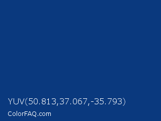 YUV 50.813,37.067,-35.793 Color is a dark blue color and the nearest color is Dark Cerulean #08457e. Hex code #0a397e and RGB value is rgb(10,57,126). In RGB color space, this color is composed of 4% red, 22% green, 49% blue, In CMYK color space, this color is composed of 92% cyan, 55% magenta, 0% yellow , 51% black , In HSL color space, this color has a hue angle of 216° , 85% saturation and 27% lightness.