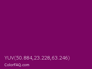 YUV 50.884,23.228,63.246 Color is a dark magenta color and the nearest color is Cardinal Pink #8c055e. Hex code #7b0562 and RGB value is rgb(123,5,98). In RGB color space, this color is composed of 48% red, 2% green, 38% blue, In CMYK color space, this color is composed of 0% cyan, 96% magenta, 20% yellow , 52% black , In HSL color space, this color has a hue angle of 313° , 92% saturation and 25% lightness.