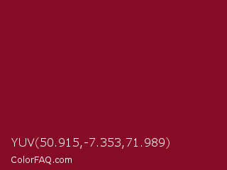 YUV 50.915,-7.353,71.989 Color is a dark red color and the nearest color is Monarch #8b0723. Hex code #850c24 and RGB value is rgb(133,12,36). In RGB color space, this color is composed of 52% red, 5% green, 14% blue, In CMYK color space, this color is composed of 0% cyan, 91% magenta, 73% yellow , 48% black , In HSL color space, this color has a hue angle of 348° , 83% saturation and 28% lightness.